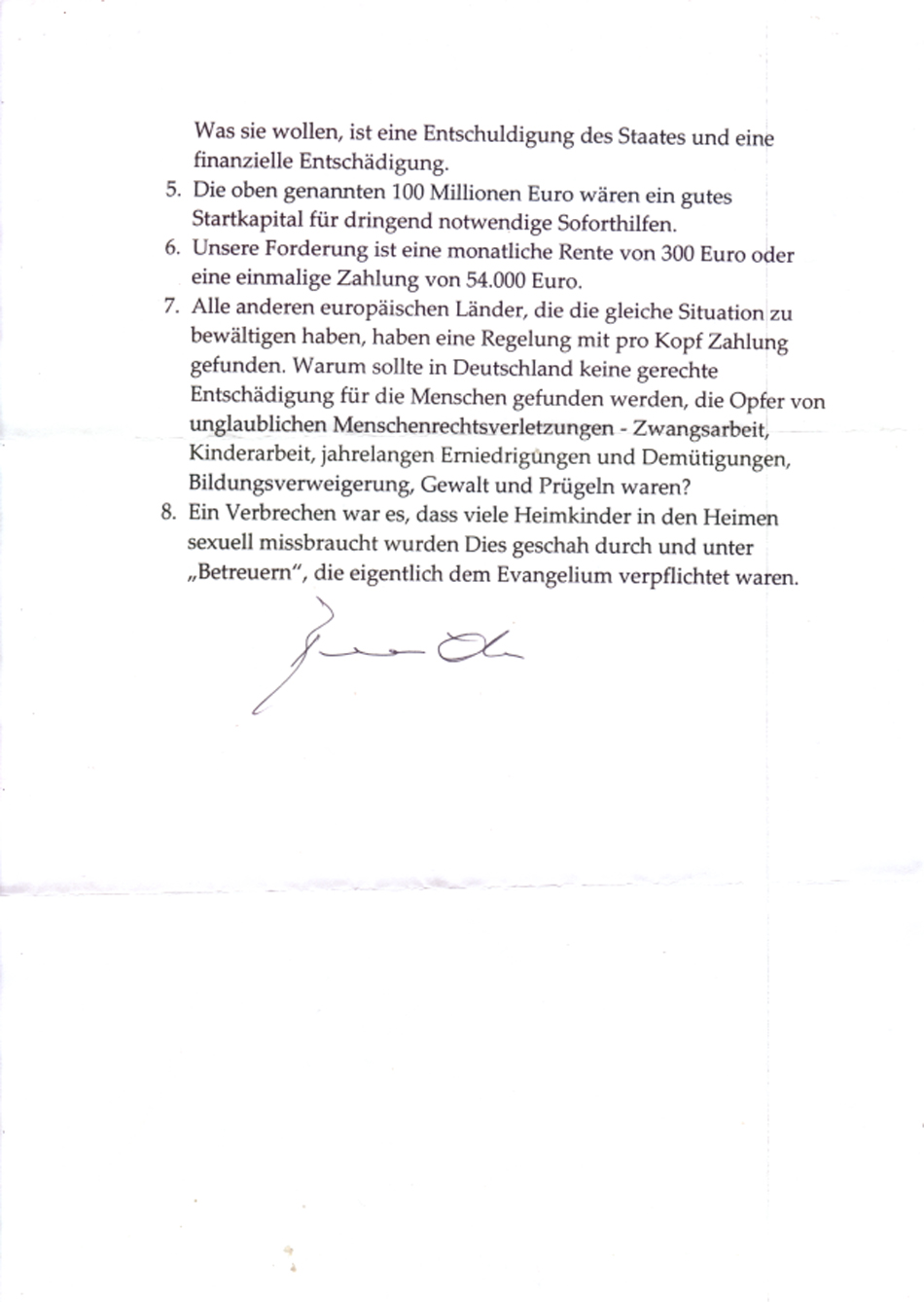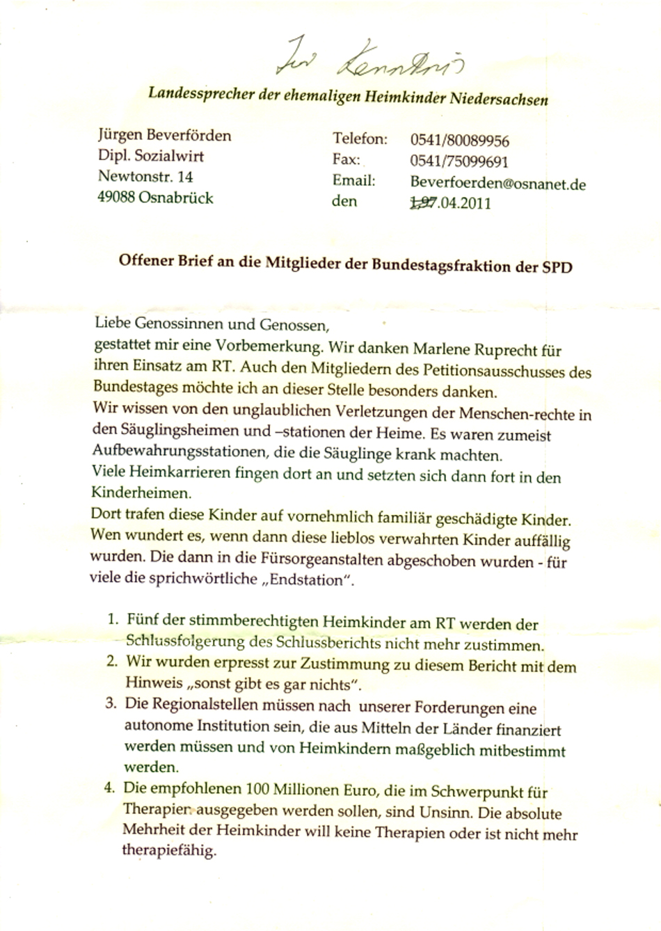 Anbei das Schreiben der Opfervertreter Runder Tisch, welches keinen Zweifel mehr darüber lässt, das dieser Runde Tisch bzw. die Opfervertreter zwar im besten Glauben aber ohne Legitimation handelten.